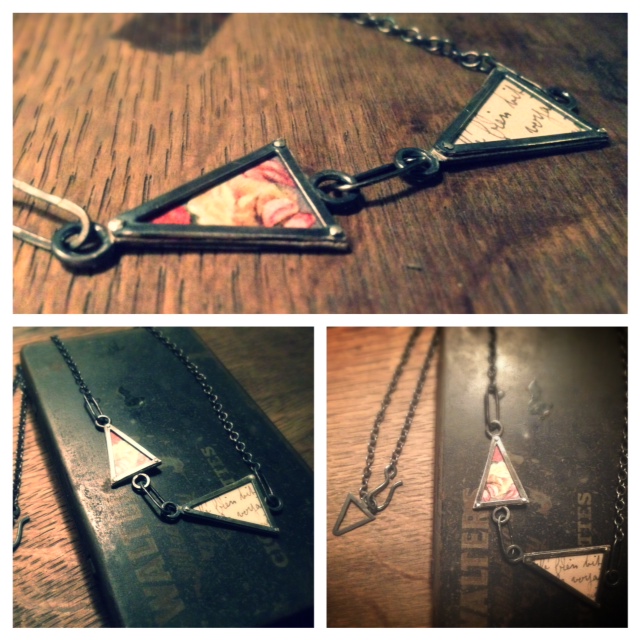 I’ve been finding it hard to juggle working part-time and making for my upcoming events. I’ve really missed the full time making of being at Uni but my part-time job has recently given me great new opportunities and I’m loving the new challenges. I suppose this is the time I’m coming to realise how difficult it is to be a full time maker and live independently from making jewellery. However, I am working out my routine and on my days off I am loving being in my workshop, turning on the radio and quietly creating. I have been designing and thinking about how I can develop my postcard jewellery into pieces which are more wearable and affordable.  I love this new piece, feminine and pretty it includes a pretty floral postcard pattern, delicate french writing and complementary oxidised sterling silver. Soon to be on show at Victoria Sewarts Contemporary Jewellery Gallery in Plymouth. Until my next day off….